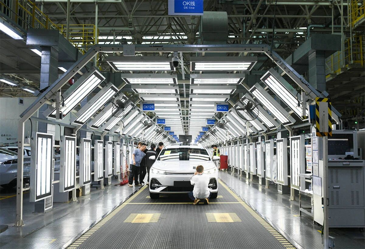 In a manufacturing facility of Chinese automotive giant Geely in Guanshanhu district, Guiyang, southwest China’s Guizhou province, operations are in full swing. Robotic arms precisely apply adhesives and install windshields, while more than 3,000 employees collaborate with automated systems, assembling vehicles with remarkable efficiency. A new car is produced approximately every 70 seconds.